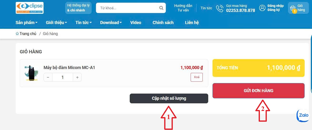 Bước 3: Sau khi thêm giỏ hàng, bạn hãy vào giỏ hàng để cập nhật số lượng và gửi đơn hàng